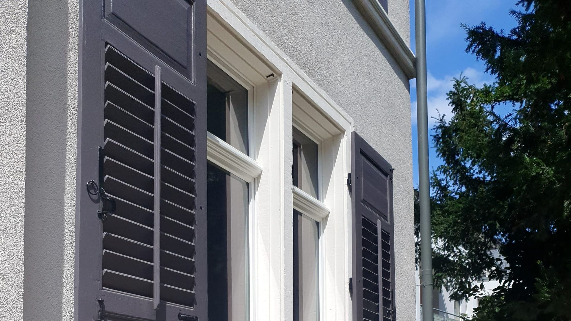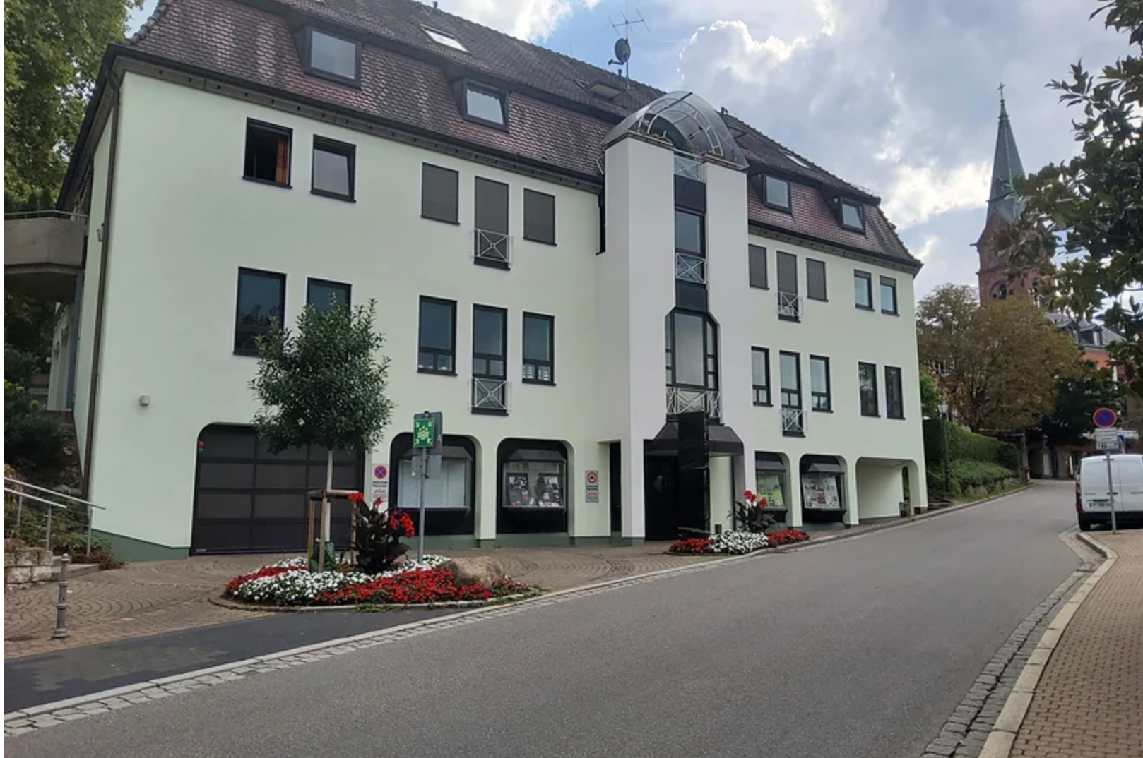 Renovierung der Außenfassade der ehemaligen Sparkasse in Badenweiler mit StoLotusan, einer Lotusblüteneffekt-Fassadenfarbe.